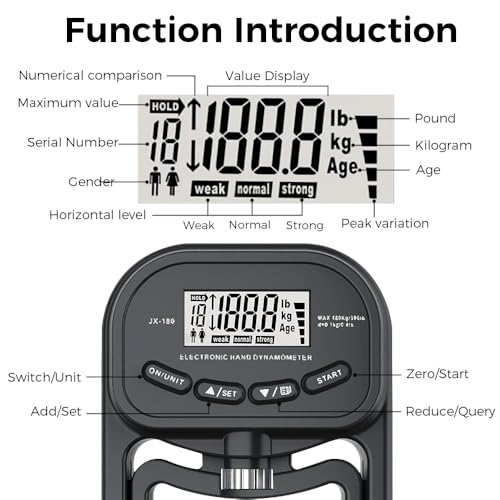 Pantalla fácil de leer: la pantalla LCD brillante proporciona una visión clara de tu fuerza de agarre en libras o kilogramos, junto con indicadores de rango y perfiles de usuario. También muestra si tu fuerza de agarre actual es débil, normal o fuerte, y muestra cualquier fluctuación de pruebas anteriores.