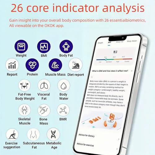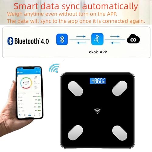 【Sincronización con aplicación y seguimiento】Aplicación «OKOK» para ios y android para obtener más datos para un análisis completo de la composición corporal. Puede realizar un seguimiento de su progreso en la aplicación para alcanzar sus objetivos de acondicionamiento físico.