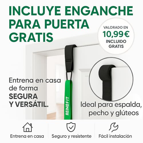 🔒 Diseñado para durar: Materiales premium y detalles de calidad Cada componente del set ha sido fabricado pensando en la resistencia y durabilidad. Las bandas están hechas de látex natural, que asegura elasticidad uniforme y resistencia al desgaste. Su grosor está optimizado para evitar roturas, incluso con uso intensivo. El enganche para puerta, por su parte, tiene costuras reforzadas y un acolchado interior que protege tanto la puerta como el usuario. Un producto premium hecho para clientes exigentes.