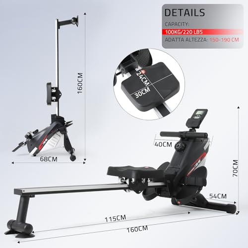Fácil de manejar: Fácil de almacenar, diseño que ahorra espacio, cómodo, con ruedas de transporte para facilitar el desplazamiento; medidas totales (longitud x anchura x altura): 156 x 55 x 70 cm; posición ajustable del asiento, nuestra máquina de remo puede soportar personas con una altura de entre 1,5 y 1,9 m.