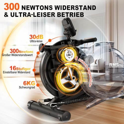 Resistencia magnética ajustable en 16 niveles para mayor silencio: A diferencia de los ruidos del agua en entrenamientos al aire libre o en máquinas de remo de agua, la MettleMatic RM5 ofrece una experiencia de entrenamiento silenciosa y agradable. Con 8 potentes imanes, alcanza una resistencia de hasta 300 Newtons. El diseño de 16 niveles permite una transición suave y ajustes precisos de la resistencia para adaptarse a diferentes fases de entrenamiento.
