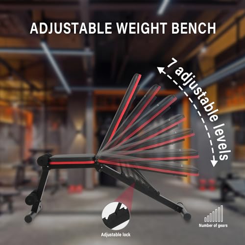【AJUSTABLES】El press banca tiene 7 posiciones ajustable con soporte de piernas/pies . El respaldo tiene 7 velocidades de ajuste, rango de ángulo -10, 0, 15, 30, 40, 50, 65 grados. La posición es rápida y fácil de ajustar con un sistema de bloqueo de perno seguro y puede utilizarse como taburete banco pesas inclinable, reclinable y plano. Perfecto para ejercicios con mancuernas, desarrollos en posición prona, también se puede ajustar como banco de abdominales. Con este banco musculación, puede trabajar eficazmente el pecho, los hombros, la espalda, el abdomen y las piernas en casa.