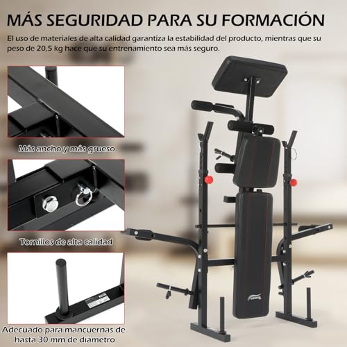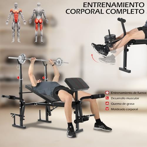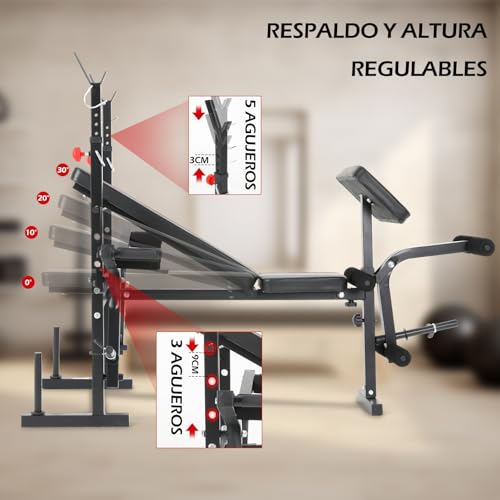 【Banco musculación multifuncional】 Banco gym multifuncional con soporte para barra, rizador de piernas, brazos de mariposa y soporte para placa de pesas. Permite el entrenamiento de fuerza integral, perfecto para el entrenamiento con barra, press de pecho, entrenamiento de hombros, entrenamiento de núcleo, press de banca, entrenamiento de brazos, entrenamiento de piernas y una variedad de entrenamiento de peso libre, puede encontrar las más formas de mejorar su entrenamiento. El nuevo diseño, almacenamiento de discos de peso adicional le ayuda a almacenar discos de peso.