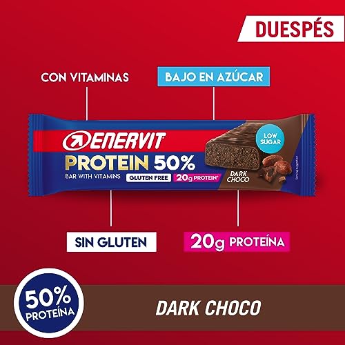 Enervit Barrita Proteica 50% Dark Choco, 20 g Proteína, Vitamina D y Vitamina B6, Sabor a Chocolate Oscuro, Sin Gluten, Bajo en Azúcar, 12 x 40g Barritas