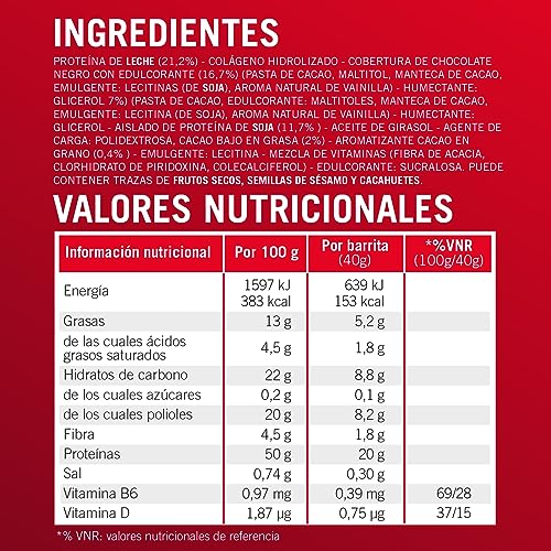 Proteínas de LECHE (21,2%) – Colágeno hidrolizado – Cobertura de chocolate negro con edulcorante (16,7%) (pasta de cacao, edulcorante: maltitoles, manteca decacao, emulgente: lecitinas (de SOJA), aroma natural de vainilla) – Humectante: Glicerina – Proteínas de SOJA (11,7%) – Aceite de girasol – Agente de carga: polidextrosa – Cacao magro en polvo (2%) – Aroma natural – Semillas de cacao granuladas (0,4%) – Emulgente: lecitinas – Mezcla de vitaminas (fibra de acacia, clorhidrato de piridoxina, colecalciferol) – Edulcorante: sucralosa. Puede contener trazas de FRUTOS DE CÁSCARA, GRANOS DE SÉSAMO Y CACAHUETES