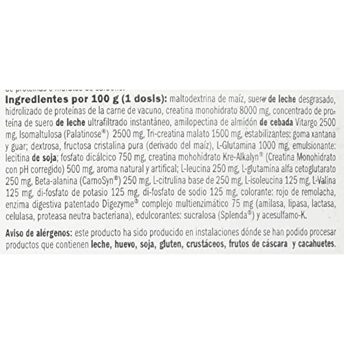 Ingredientes por 100 g (1 dosis): maltodextrina de maíz, suero de leche desgrasado, hidrolizado de proteínas de la carne de vacuno, creatina monohidrato 8000 mg, concentrado de proteína de suero de leche ultrafiltrado instantáneo, cacao en polvo (sólo en sabor chocolate), amilopectina de almidón de cebada Vitargo 2500 mg, Isomaltulosa (Palatinose) 2500 mg, Tri-creatina malato 1500 mg, estabilizantes: goma xantana y goma guar; dextrosa, fructosa cristalina pura (derivado del maíz), L-Glutamina 1000 mg, emulsionante: lecitina de soja; fosfato dicálcico 750 mg, Kre-Alkalyn (Creatina Monohidrato con pH corregido) 500 mg, aroma; L-leucina 250 mg, L-glutamina alfa cetoglutarato 250 mg, Beta-alanina (CarnoSyn) 250 mg, L-citrulina base 250 mg, L-isoleucina 125 mg, L-Valina 125 mg, di-fosfato de potasio 125 mg, di-fosfato de sodio 125 mg, colorante: (frutos del bosque y sabor fresa-plátano – rojo de remolacha); enzimas digestivas patentado Digezyme complejo multienzimático 75 mg (amilasa, lipasa, lactasa, celulasa, proteasa neutra bacteriana); edulcorantes: sucralosa (Splenda) y acesulfamo-K.