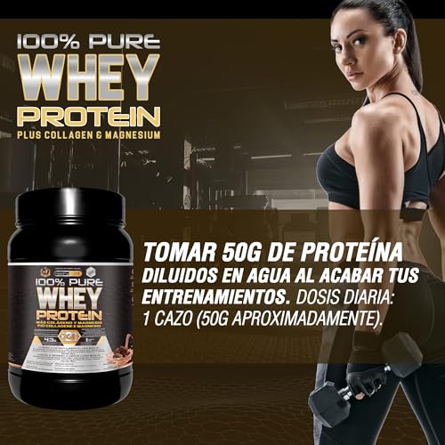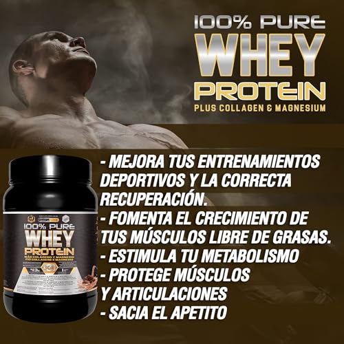 Whey Protein. 100% pura con colágeno + magnesio. Tonifica y aumenta la masa muscular. Protege músculos. 1000g de proteína pura. Sabor a chocolate.