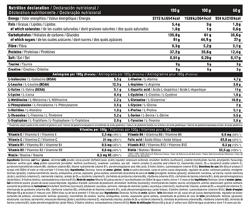 Dextrosa, harina de avena, leche en polvo desnatada, cacao en polvo desgrasado 10/12, taurina, creatina, amilopectina, aromas, espesante: goma xantana, concentrado de proteína de suero de leche (emulgente: lecitina de soja), mezcla vitamínica (dextrosa, vitamina C (ácido L-ascórbico), vitamina B3 (niacinamida), vitamina E (alfa-tocoferol), vitamina B6 (clorhidrato de piridoxina), vitamina B2 (riboflavina), vitamina B1 (clorhidrato de tiamina), ácido fólico (ácido pteroilmonoglutámico), biotina y vitamina B12 (cianocobalamina)), edulcorante: sucralosa y sal.