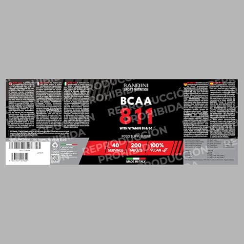 💪 ALTO RENDIMIENTO. Complemento alimenticio a base de aminoácidos de cadena ramificada con una proporción equilibrada 8:1:1 y enriquecido con vitaminas B1 y B6. Envase de 200 comprimidos, para un total de 40 dosis. Los aminoácidos BCAA 811 de Bandini Pharma están probados para preservar y construir masa muscular magra, proporcionando la dosis adecuada de Leucina, Valina e Isoleucina, para integrar la dieta y la nutrición deportiva.