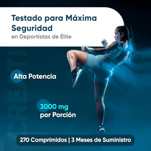 Creatina Monohidratada 3000mg – 270 Comprimidos – Para Masa Muscular Aumento Rápido, Fuerza y Resistencia Física en Entrenos – Suplemento Deportivo Potenciador para Hombre y Mujer, Vegano y Sin OGM