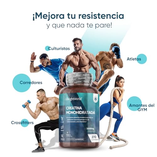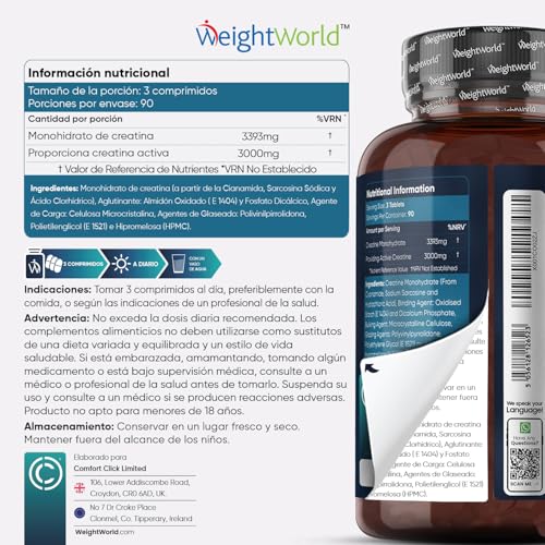 ¿Por Qué Elegir el Monohidrato de Creatina de WeightWorld? – Si estás en búsqueda de anabolizantes naturales que te impulsen hacia nuevos horizontes fitness, tenemos tu solución perfecta. Obtén el empujón de potencia y optimiza tus entrenamientos como nunca. Con una dosis de 3000mg por porción, nuestro suplemento de creatina en comprimidos te ofrece el combustible que necesitas para 3 meses.