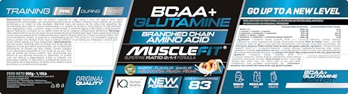 MuscleFit Glutamina + BCAA´s | Aminoácido Ramificado | Sabor Melocotón | 12g dosis diaria | Potente anti-catabólico