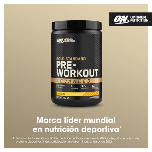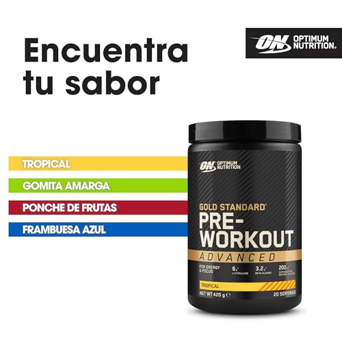 Optimum Nutrition, la marca de nutrición deportiva n.º 1 del mundo*, te ofrece la versión intensa y mejorada de nuestro polvo básico para antes del entrenamiento. Conoce el complemento alimenticio deportivo ON Gold Standard Polvo Avanzado de Proteína Pre-Entrenamiento, diseñado para atletas de alto rendimiento y verdaderos entusiastas de los deportes. Esta intensa fórmula previa al entrenamiento impulsa la energía y la concentración para respaldar tu entrenamiento máximo. En comparación con el polvo previo al entrenamiento Gold Standard, este polvo avanzado contiene 8 veces más L-citrulina y 2 veces más beta-alanina por porción. La fórmula ON contiene 200 mg de cafeína de fuentes naturales por porción, lo que la convierte en una excelente bebida energética y de concentración que aumenta el estado de alerta y mejora la concentración***, lo que lo ayuda a lograr tus objetivos de acondicionamiento físico. El suplemento pre-entrenamiento ON Advanced contiene vitaminas B6, B12, niacina y ácido pantoténico, que ayudan a mantener el metabolismo energético normal y a reducir el cansancio y la fatiga**. Diseñado para el atleta enfocado en objetivos, el Pre-entrenamiento Avanzado ON viene en 4 sabores deliciosos: Tropical, Gominola Agria, Ponche de Frutas, Frambuesa Azul. Además, son una adición fácil y conveniente a tu rutina diaria de ejercicios y suplementos. Para disfrutarlo, mezcla 3 cucharadas (21 g) en 400 ml de agua fría y agita. Consumo recomendado de 1 ración al día. Consumir 45-60 minutos antes del ejercicio. * Fuente: Euromonitor International Limited; Consumer Health Edición 2023, categoría Sports Protein Powder, % DE PARTICIPACIÓN DE VALOR MINORISTA, DATOS DE 2022 **Fuente REGLAMENTO DE LA COMISIÓN (UE) No 432/2012 ***Fuente EFSA Journal 2011;9(4):2054 24