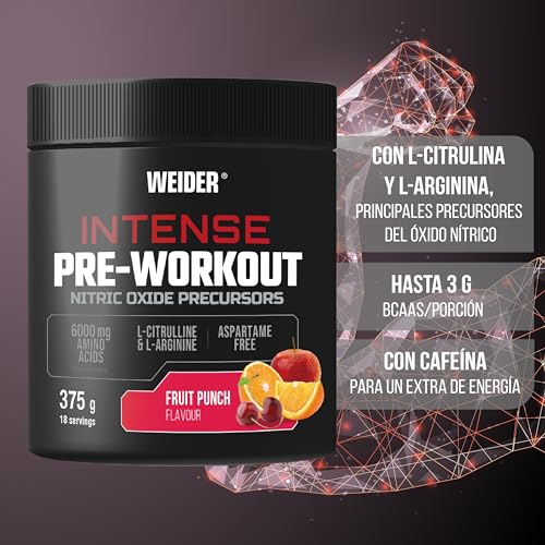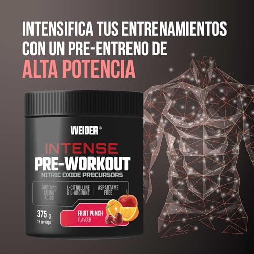 Weider Intense Pre-workout (375g) Sabor Fruit Punch. Precursor de Óxido Nítrico, con 200 mg de Cafeína y 6000 mg de Aminoácidos/porción, L-Citrulina, L-Arginina, Sin Aspartamo (18 porciones)