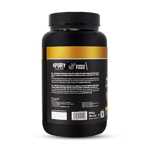 Complemento alimenticio a base de complejo de enzimas digestivas (alfa-amilasa, proteasa, celulasa, beta-D-galactosidasa y lipasa) proteina y aminoácidos con edulcorante Los complementos alimenticios no deben utilizarse como sustituto de una dieta equilibrada. No superar la dosis diaria expresamente recomendada. Mantener fuera del alcance de los niños más pequeños. Conservar en un lugar fresco y seco. Contiene leche y soja