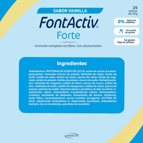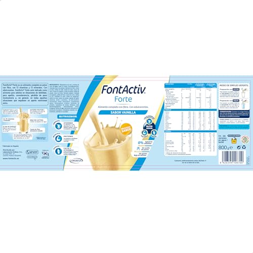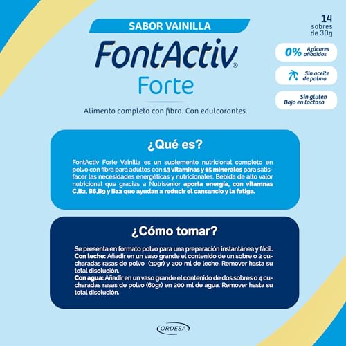 FontActiv Forte Vainilla es un suplemento nutricional completo en polvo con fibra para adultos con 13 vitaminas y 15 minerales para satisfacer las necesidades energéticas y nutricionales. ¿QUÉ ES? Bebida de alto valor nutricional que gracias a Nutrisenior aporta energía, con vitamnas C,B2, B6,B9 y B12 que ayudan a reducir el cansancio y la fatiga. Con un 100% de proteínas del suero de alto valor biológico y fácil asimilación que contribuye a conservar la masa muscular. Aporta el 100% de la Vitamina D y el 47% del calcio para el mantenimiento de unos huesos normales. Además; – Aporta los nutrientes de una dieta completa y equilibrada. – 0% azúcares añadidos- Con edulcorantes (acesulfame K y sucralosa). – Sin lactosa, sin aceite de palma. – Fuente de zinc, cobre, selenio y vitamina C, compuestos antioxidantes para el sistema inmune. – Fuente de fibra soluble para el tránsito intestinal y fructooligosacáridos para el equilibrio de la microbiota intestinal. ¿PARA QUIÉN? Para adultos como complemento a la alimentación en situaciones de debilidad, poco apetito, convalecencia, pérdida de peso involuntaria y en situaciones que requieran un aporte nutricional extra. ¿CÓMO TOMAR? Se presenta en formato polvo para una preparación instantánea y fácil con leche o con agua. Con leche- Añadir en un vaso grande 2 cucharadas rasas de polvo (30gr) y 200 ml de leche. Remover hasta su total disolución. Con agua- Añadir en un vaso grande 4 cucharadas rasas de polvo (60gr) en 200 ml de agua. Remover hasta su total disolución. Se recomienda de 1 a 2 bebidas al día para complementar la alimentación, ya sea en el desayuno, media mañana o merienda. INDICACIONES: Una vez preparado, consumir inmediatamente. No administrar en niños menores de 3 años. No debe usarse en personas con galactosemia. Guardar en lugar fresco y seco. Mantener una dieta variada y equilibrada y un estilo de vida saludable.