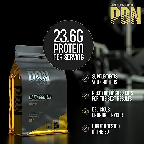 PBN – Premium Body Nutrition Proteína de suero de leche en polvo, 1 kg (sabor plátano), nuevo sabor mejorado. Cada ración contiene 23.6 g de proteína