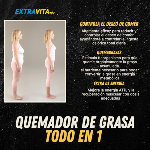 extraVITA- Quemagrasas Potente para Adelgazar, Control del Apetito en 3-4 semanas, L-Carnitina, Garcinia, Curcuma | Termogénico y Adelgazante | 60 cápsulas