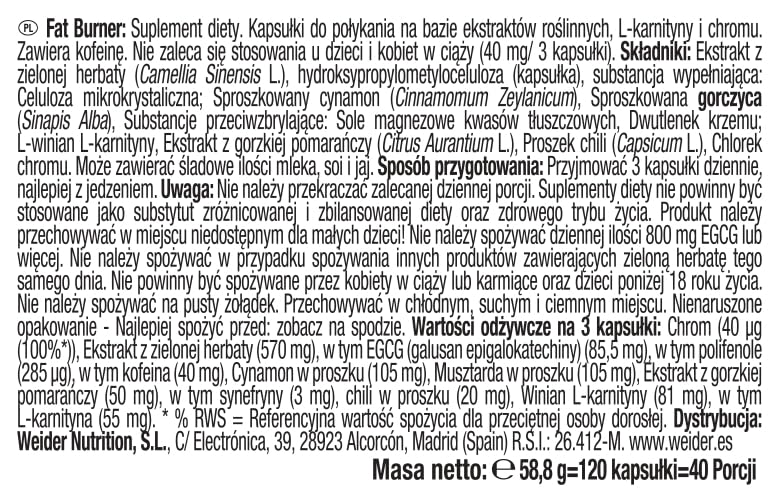 Extracto de té verde (Camellia sinensis L.), hidroxipropilmetil-celulosa(capsula), agente de carga: celulosa microcristalina; canela en polvo (Cinnamomum zeylanicum), MOSTAZA en polvo (Sinapis alba), antiaglomerantes: sales magnésicas de ácidos grasos, dióxido de silicio; L-carnitina, L-tartrato, extracto de naranja amarga (Citrus aurantium L.), chile en polvo (Capsicum L.), cloruro de cromo. Puede contener trazas de lactosa, soja, gluten y huevo.