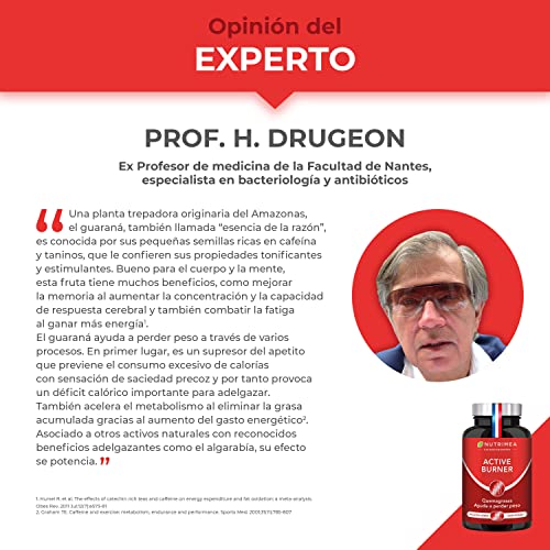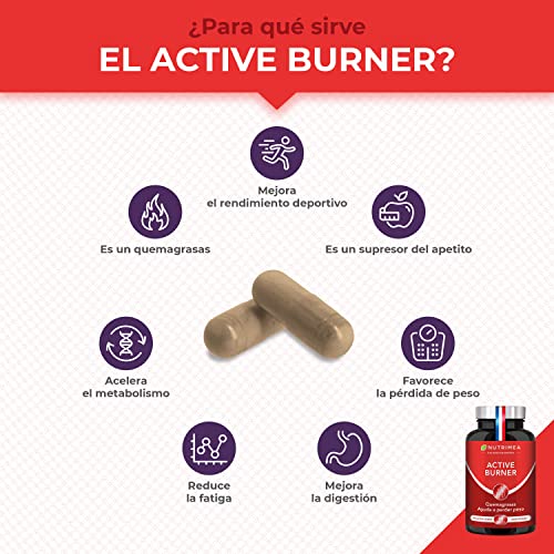 QUEMAGRASAS POTENTE PARA ADELGAZAR: Nuestro complemento alimenticio Active Burner es ideal para suprimir el apetito y perder peso rápido. Nuestra formula es 100% Natural a base de Guaraná, Jengibre, Café Verde, Fucus y Cola. Ayuda aumentar el rendimiento deportivo, a dar más energía y a mejorar el metabolismo.