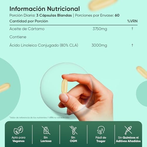 CLA Vegano y de Ingredientes de Orgien Natural – Este CLA está formulado con aceite de cártamo puro natural, sin OGM, químicos ni aditivos añadidos. Además, es completamente apto para dietas veganas, sin gluten y sin lactosa. Gracias a su formato perla y tamaño reducido, estas cápsulas blandas son fáciles de tomar.