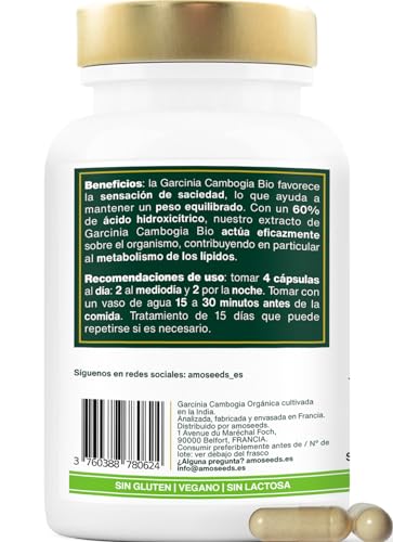✅ CERTIFICADA ORGÁNICA: frasco reciclable y resellable con 60 cápsulas que contienen 500mg de extracto de Garcinia Cambogia orgánica de calidad superior amoseeds. Producto 100% puro, vegano, sin conservantes, sin OMG, sin pesticidas, sin colorantes artificiales, sin gluten y sin lactosa. Cada lote es analizado por terceros para garantizar su calidad y pureza.