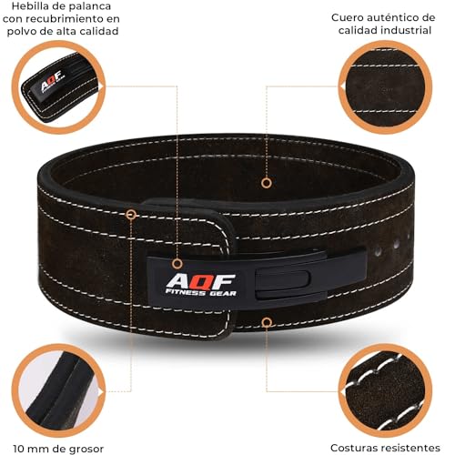 AQF cinturón lumbar gym cuero genuino para powerlifting tiene 10 mm de ancho y 10 mm de grosor, y es perfecto para proporcionar soporte adicional a la espalda y los abdominales durante levantamientos pesados que requieran reforzar el tronco, como sentadillas, peso muerto y press weightlifting.