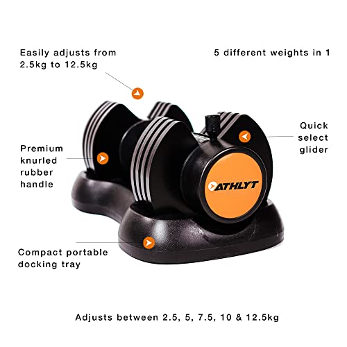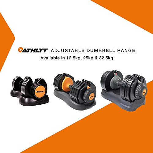 MULTIPLES PESOS: La mancuerna ajustable ATHLYT dispone de diferentes rangos de peso – desde 2.5 kg hasta 12.5 kg (2,5, 5, 7,5, 10, 12,5 kg) – para que puedas llevar a cabo entrenamientos de fuerza y realizar ejercicios de levantamientos pesados de piernas