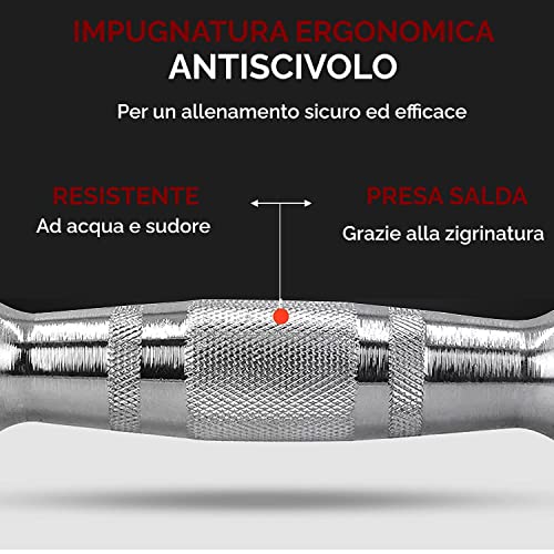 Fabricado con materiales de calidad, los extremos están recubiertos de goma sólida que ayuda a evitar daños en el suelo en caso de caída de pesas. La goma cubre el núcleo de hierro que es la parte que determina el peso del manillar