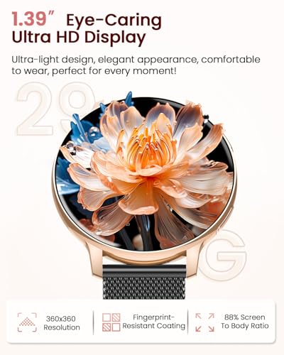Una Elección Elegante para Tu Muñeca: el reloj inteligente mujer diseñado específicamente para mujeres, con una pantalla de protección ocular de alta definición de 1,39 pulgadas para reducir la fatiga ocular, resolución ultra clara de 360*360 píxeles, imágenes más vívidas y delicadas y más de 400 esferas de reloj para elegir o personalizar. Cuerpo ligero de 29 g, más ligero de llevar. Viene con dos correas, lo que hace que sea fácil combinarlo con tu look para negocios, ocio o deportes.