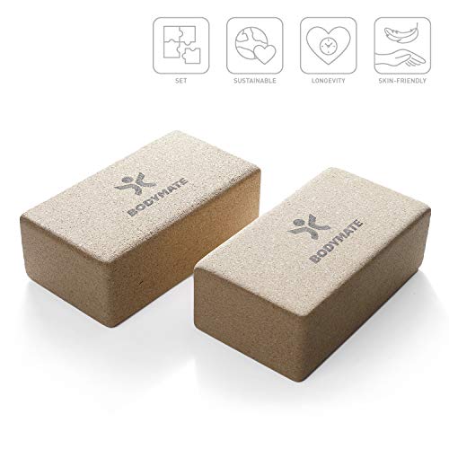 BODYMATE Bloques de Yoga de Corcho Natural 100% ecológico, 2X Ladrillos de Yoga, Apoyo para Todas Las asanas, meditaciones y Ejercicios de relajación, para Principiantes y Profesionales, 22x12x7,5cm