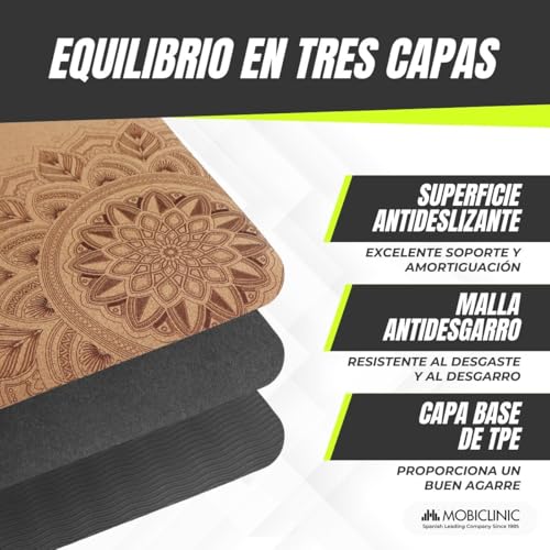 Mobiclinic®, Esterilla yoga corcho natural, Antideslizante, Bolsa de transporte, Antimicrobiana, 4mm grosor, Tpe 100% reciclable, Ecológica, 183x61cm, Diseño mandala, Ey-02, Pilates, Fitness