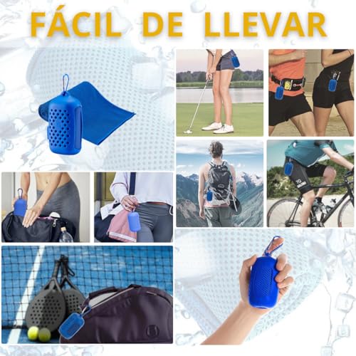 🔝 [PRÁCTICO Y COMPACTO] : La toalla refrigerante viene incluida en una funda de silicona, siendo respetuosos con el Medio Ambiente no utilizando fundas de plástico, de alta calidad que es suave, elástica, resistente a la temperatura e impermeable y junto a un mosquetón para hacer fácil y cómodo su transporte. El diseño liviano y compacto es ideal para que la puedas colgar o enganchar donde mejor te convenga (mochila, bolsa, pantalón, cinturón…)